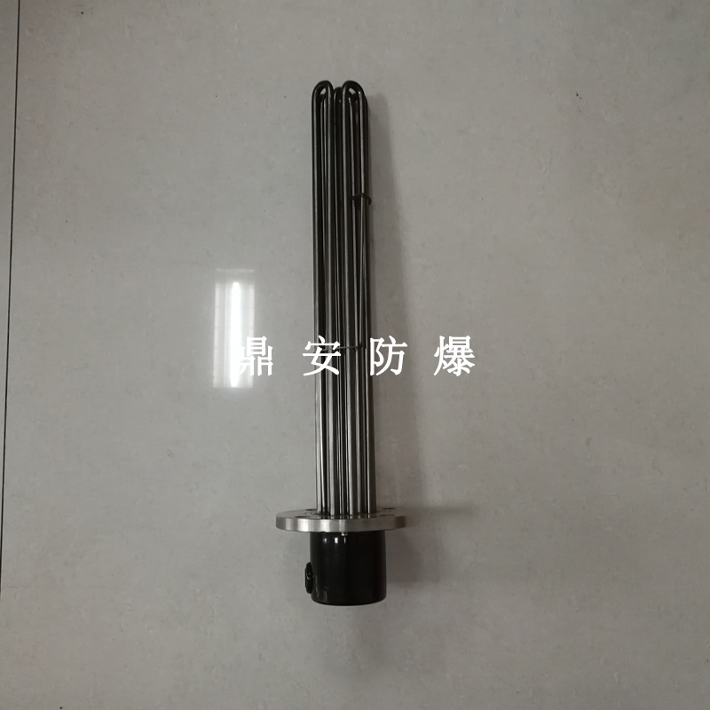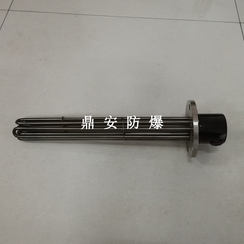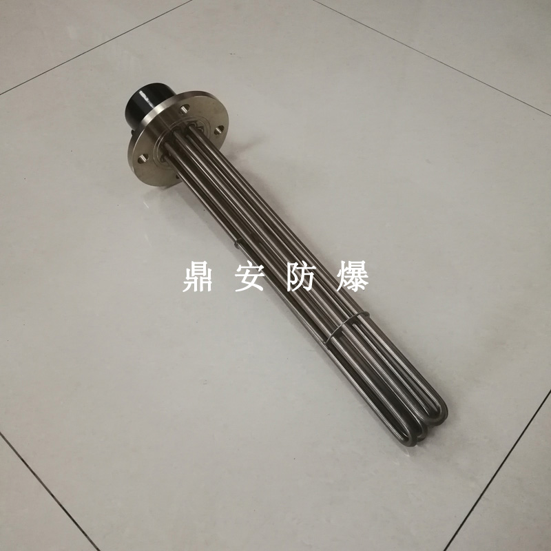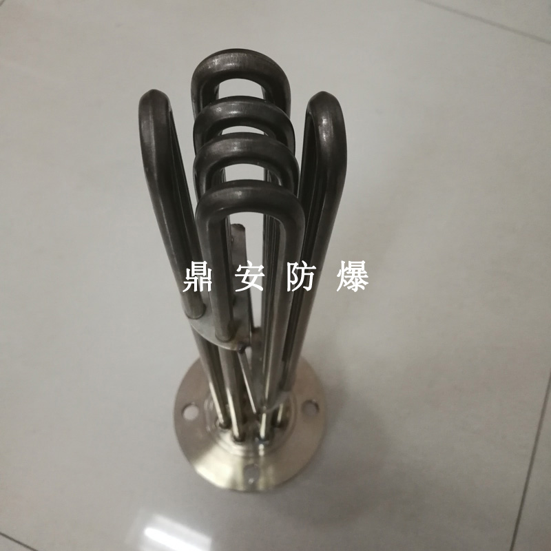 法蘭電熱管(也稱插入式電加熱器):是采用U型管狀電熱元件,多支U型電熱管焊接在法蘭上集中加熱,依據(jù)加熱不同介質(zhì)設(shè)計(jì)規(guī)范,按照功率配置要求裝配在法蘭蓋上,插入需加熱物料中,發(fā)熱元件工作時(shí)所發(fā)出的大量熱量傳導(dǎo)給被加熱介質(zhì)使介質(zhì)溫度升高,達(dá)到所需的工藝要求,主要用于敞開式、封閉式的溶液箱和循環(huán)系統(tǒng)中加熱用。
