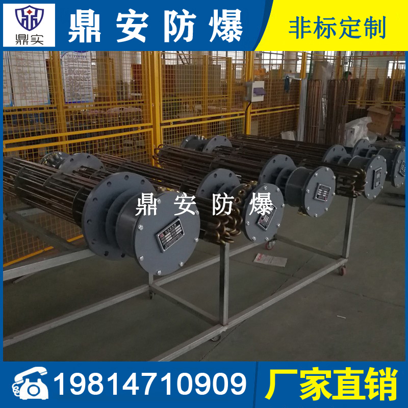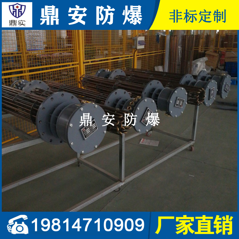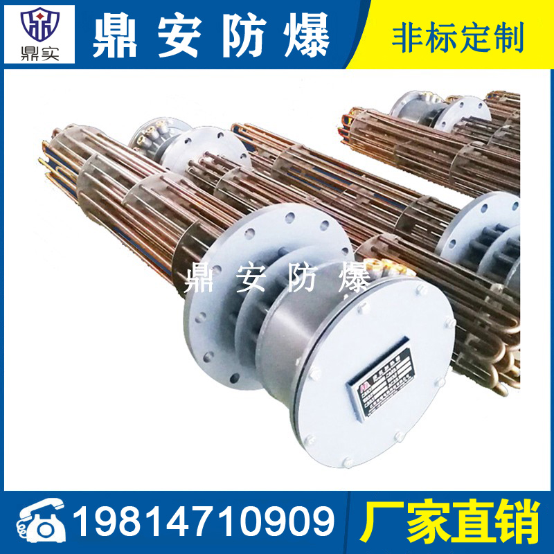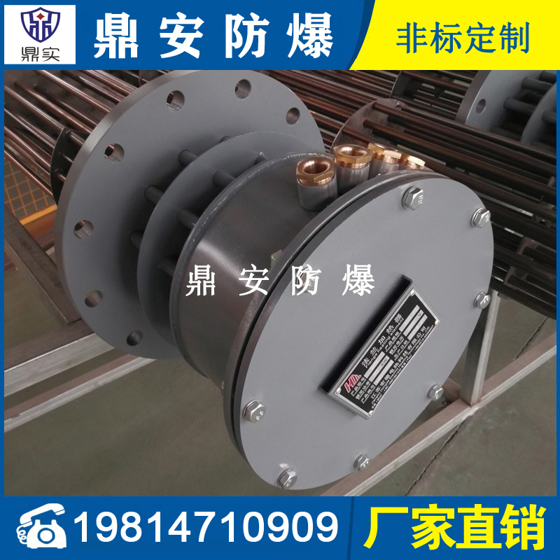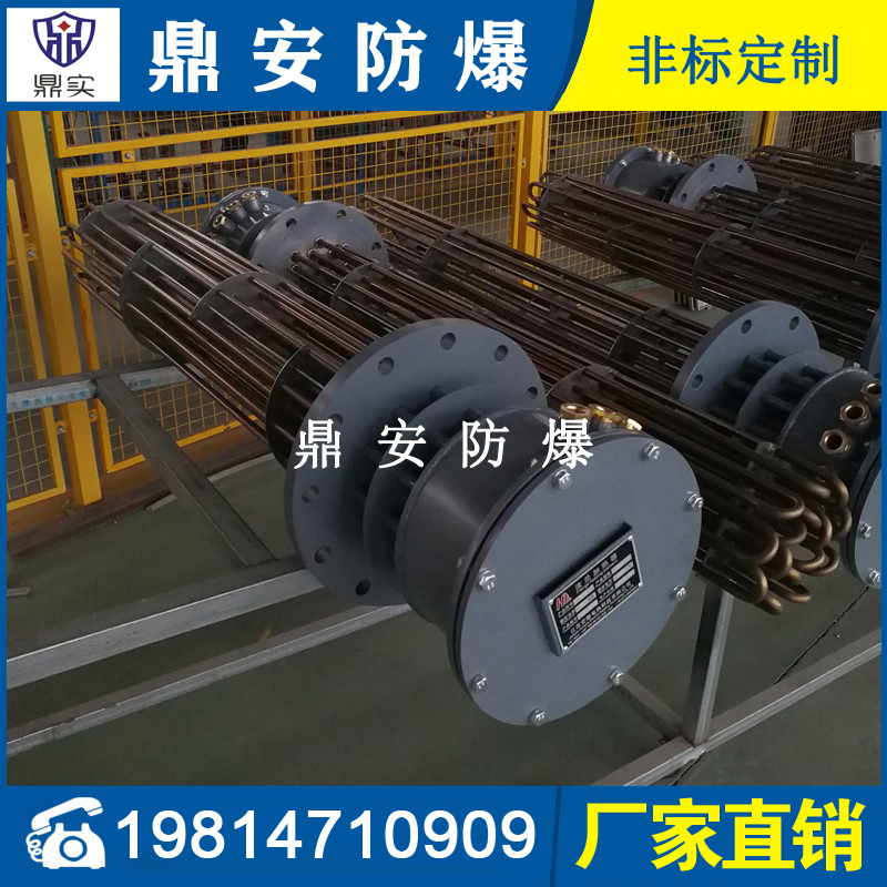 防爆法蘭加熱管是由多支加熱管焊接在法蘭上集中加熱。主要用于敞開式、封閉式的溶液箱和循環(huán)系統(tǒng)中加熱用。優(yōu)點: 表面功率大,使一般電加熱表面負荷的2~4倍,高度密集式、結構緊湊。由于整體短而密集,故穩(wěn)定性好,安裝無需支架。組合式法蘭加熱管大多采用氬弧焊接方式使電熱管于法蘭連接,也可利用緊固裝置的形式,即每支電熱管上焊由緊固件。然后與法蘭蓋采用螺母鎖緊。管子于緊固件采用氬弧焊接。緊固件密封處采用科學的工藝。單支更換方便,大大節(jié)約以后的維修成本選擇進口及國內優(yōu)質材料。科學的生產(chǎn)工藝,嚴格的質量管理,保證電熱管優(yōu)越的電氣性能。
