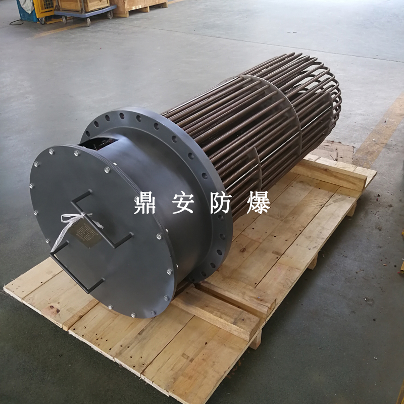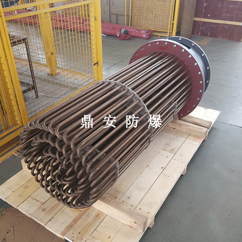 法蘭電熱管(也稱插入式電加熱器):是采用U型管狀電熱元件,多支U型電熱管焊接在法蘭上集中加熱,依據(jù)加熱不同介質(zhì)設計規(guī)范,按照功率配置要求裝配在法蘭蓋上,插入需加熱物料中,發(fā)熱元件工作時所發(fā)出的大量熱量傳導給被加熱介質(zhì)使介質(zhì)溫度升高,達到所需的工藝要求,主要用于敞開式、封閉式的溶液箱和循環(huán)系統(tǒng)中加熱用。