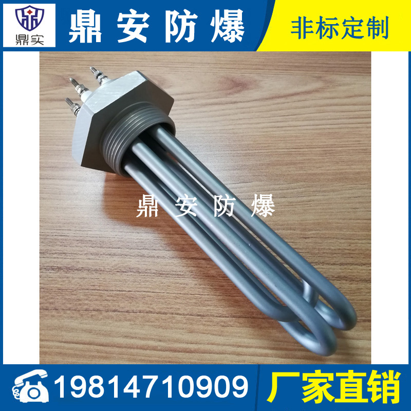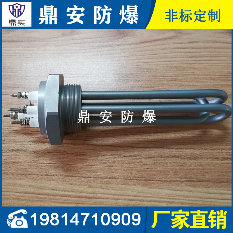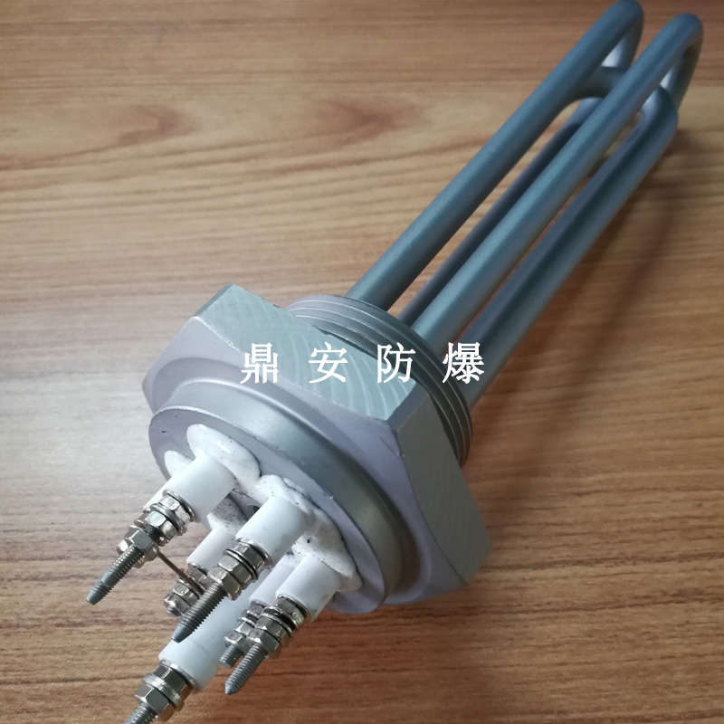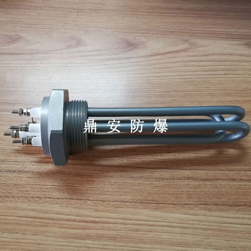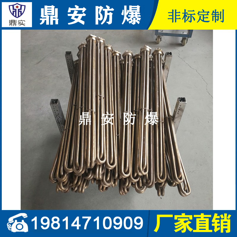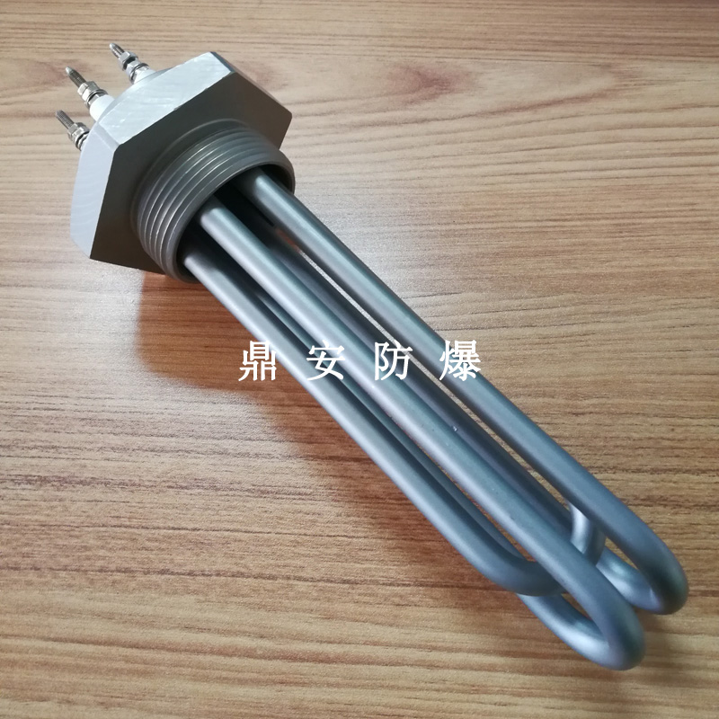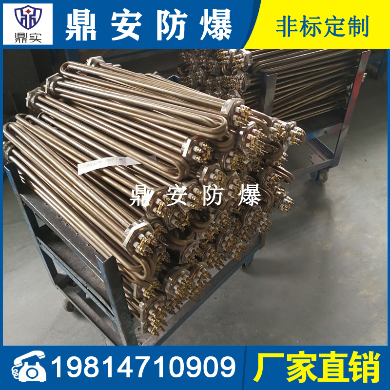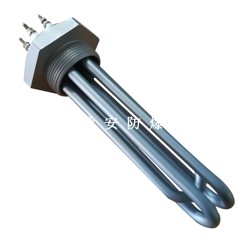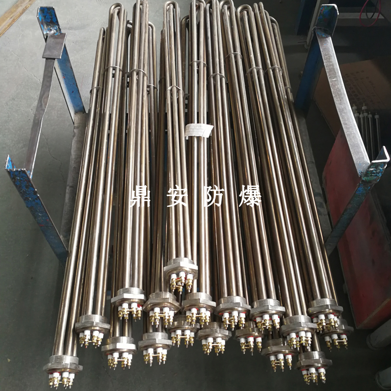 法蘭電熱管(也稱插入式電加熱器):是采用U型管狀電熱元件,多支U型電熱管焊接在法蘭上集中加熱,依據(jù)加熱不同介質(zhì)設(shè)計(jì)規(guī)范,按照功率配置要求裝配在法蘭蓋上,插入需加熱物料中,發(fā)熱元件工作時(shí)所發(fā)出的大量熱量傳導(dǎo)給被加熱介質(zhì)使介質(zhì)溫度升高,達(dá)到所需的工藝要求,主要用于敞開(kāi)式、封閉式的溶液箱和循環(huán)系統(tǒng)中加熱用。