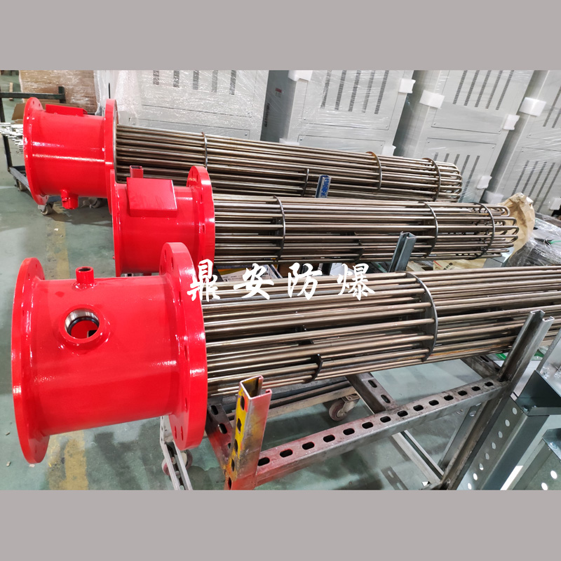 法蘭電熱管(也稱插入式電加熱器):是采用U型管狀電熱元件,多支U型電熱管焊接在法蘭上集中加熱,依據(jù)加熱不同介質設計規(guī)范,按照功率配置要求裝配在法蘭蓋上,插入需加熱物料中,發(fā)熱元件工作時所發(fā)出的大量熱量傳導給被加熱介質使介質溫度升高,達到所需的工藝要求,主要用于敞開式、封閉式的溶液箱和循環(huán)系統(tǒng)中加熱用。